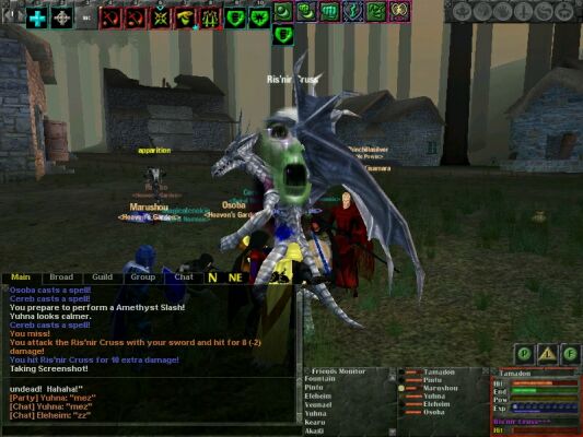 この時点でみなさん解散となりましたが、私とRilissaさんとガイジンCleさんの3人だけまだやる事にしました。3人ではどうにもならんので周りのガイジンさんを適当にナンパします。最終的にMer2・Pal1・Sor2・Cle1・Inf2というただでは氏なんぞ、倒れるなら前のめりに的なパーティーの完成です。